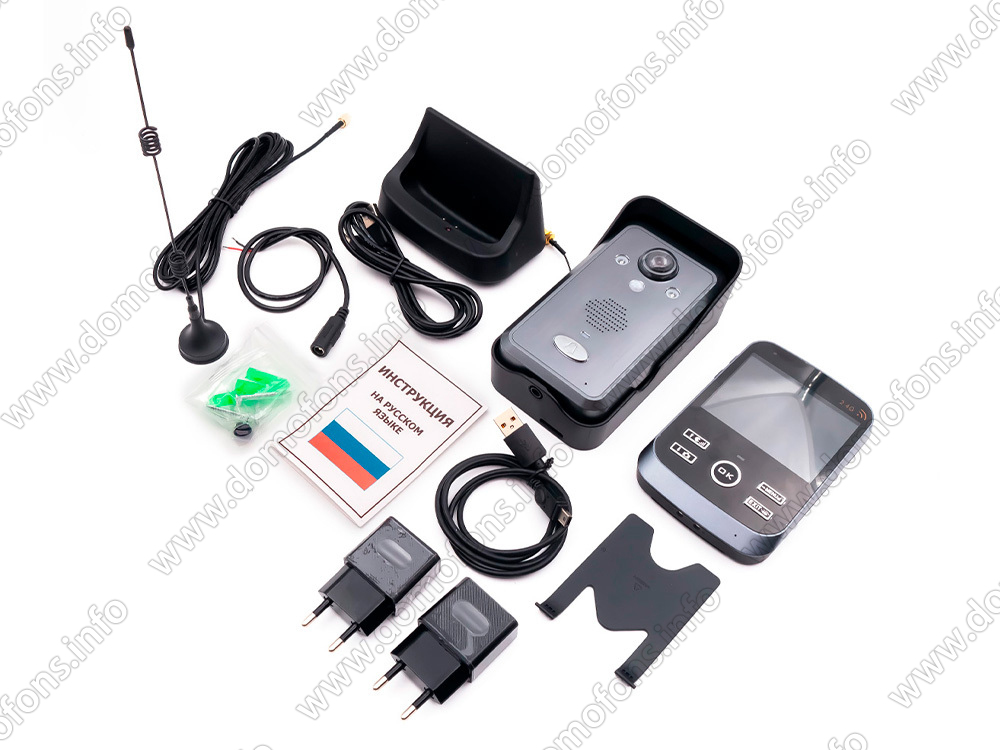 Функционал домофона позволяет дистанционно управлять электрозамком, и открывать, таким образом, дверь. Трубки также могут работать от аккумулятора (до 100 часов в режиме ожидания, и до 3 часов в режиме беспрерывного общения). Время полной зарядки трубки – 3 часа. В базовый комплект входит блок питания, зарядное устройство, USB кабель для обмена файлами с компьютером и другими устройствами.